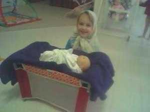 Yesterday “The Ladies” were playing “Mary, Joseph and Baby Jesus.” They were dressed up in “middle-eastern” garb (aka blankets over their head) and had a small manger complete with “Baby Jesus” sitting right in the middle of our living room.