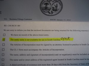 Me: Hi! My name is Paul. I just got a document stating that we can’t have the name Church180! Why is that? I’ve researched this and there is no other organization in South Carolina with this name!