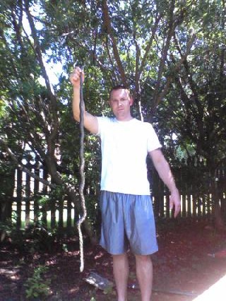 Talking on the phone this a.m. I looked over the edge of the back porch railing and saw this snake! AHHH!!! Get off the phone. Put on shoes. Grab shovel! Dismember snake!