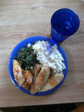 I had 8 oz of tilapia, 1 cup of greens, 1 cup of white rice, multiple glasses of water, and 1 cup of coffee.