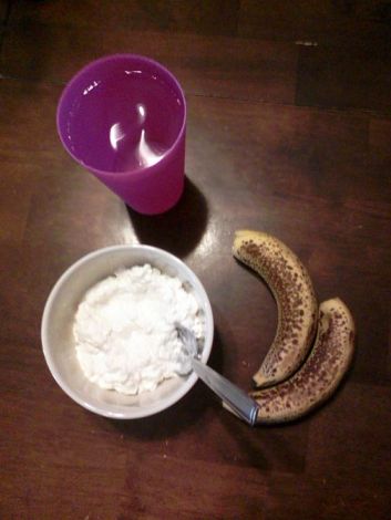 I grabbed 1 cup of cottage cheese, 2 small bananas, and 1 cup of water.