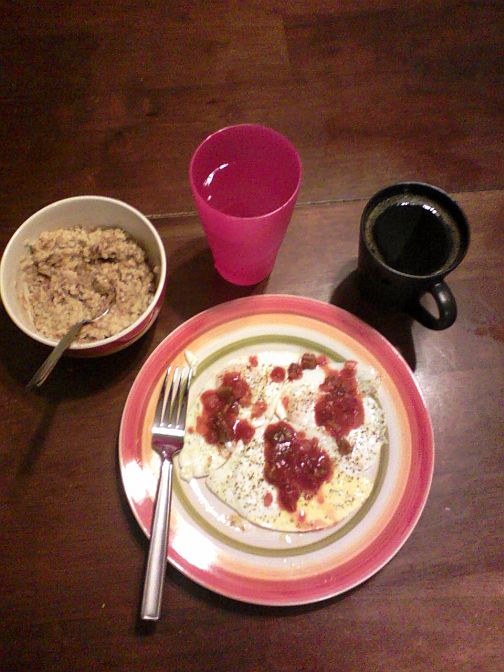 3 eggs cooked in virgin olive oil with 2 tbsp of salsa. 3/4 cup of oatmeal with 1 packet of Truvia (natural sweetner) and cinammon. 1 glass of water, 2 cups of coffee, and a multivitamin.