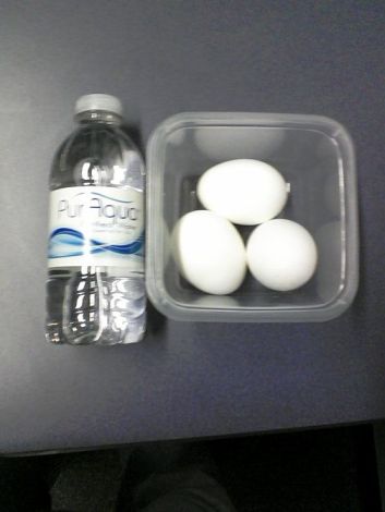 3 boiled eggs and a bottle of water.