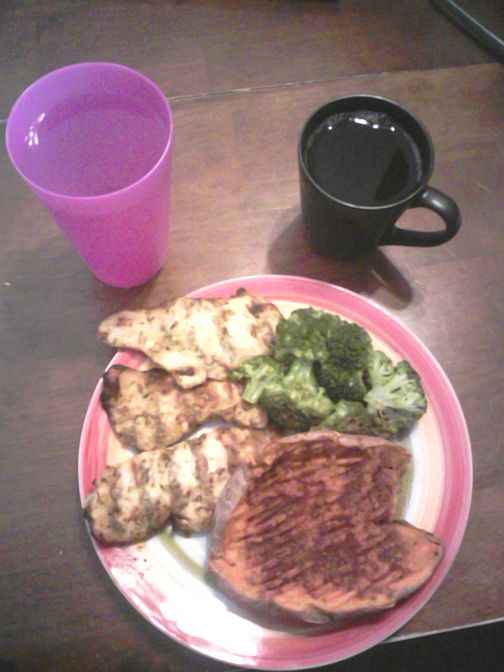 8 oz. of grilled chicken (with Mrs. Dash seasoning to make it tasty). 1 sweet potato with 1/2 packet of Truvia and cinammon. 1 cup of brocoli. Water and coffee.