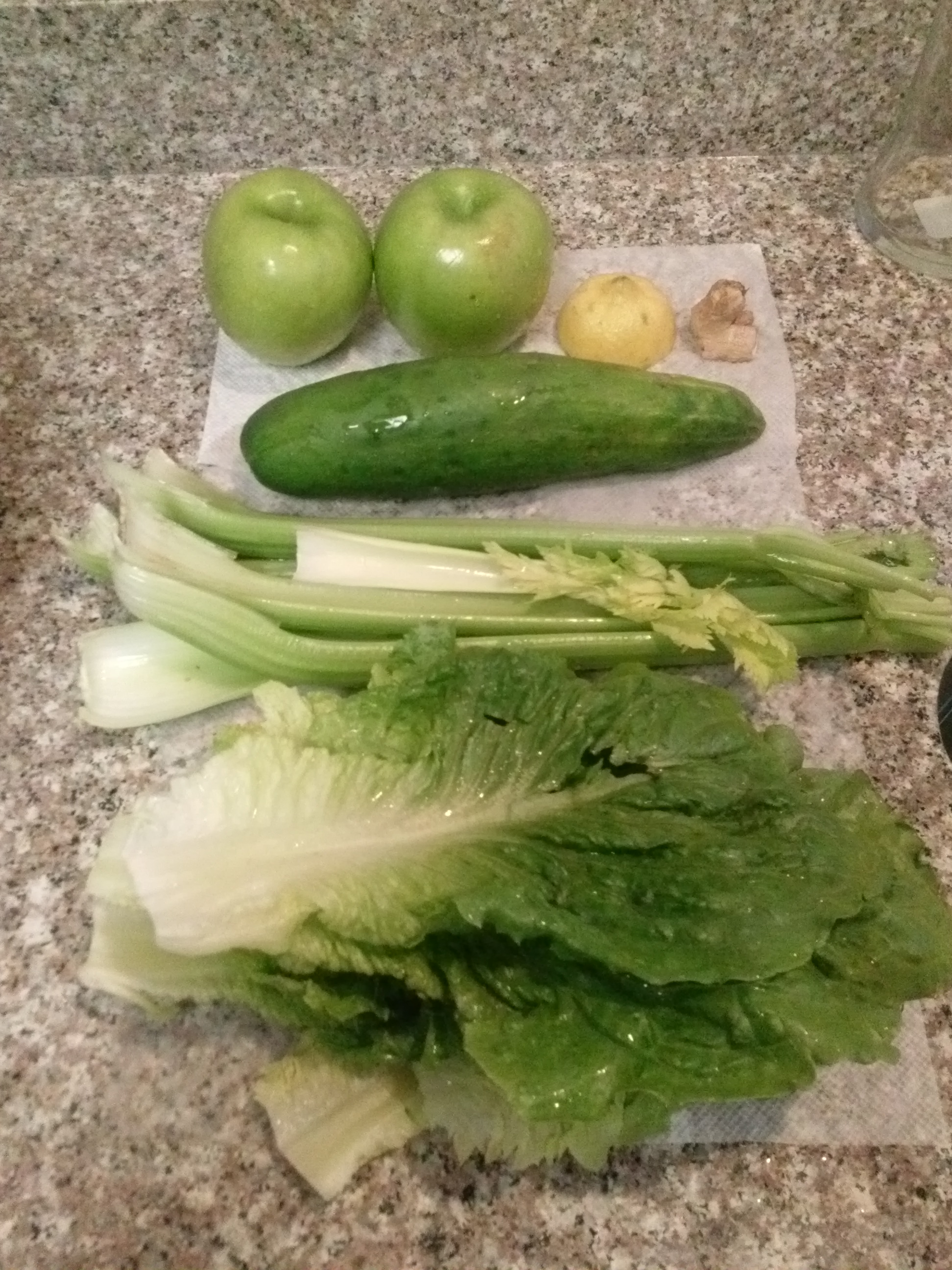 Green juice (apples, lemons, ginger, cucumber, celery, and kale. Pictured here is 1/2 head of romaine lettuce since we had run out of kale).