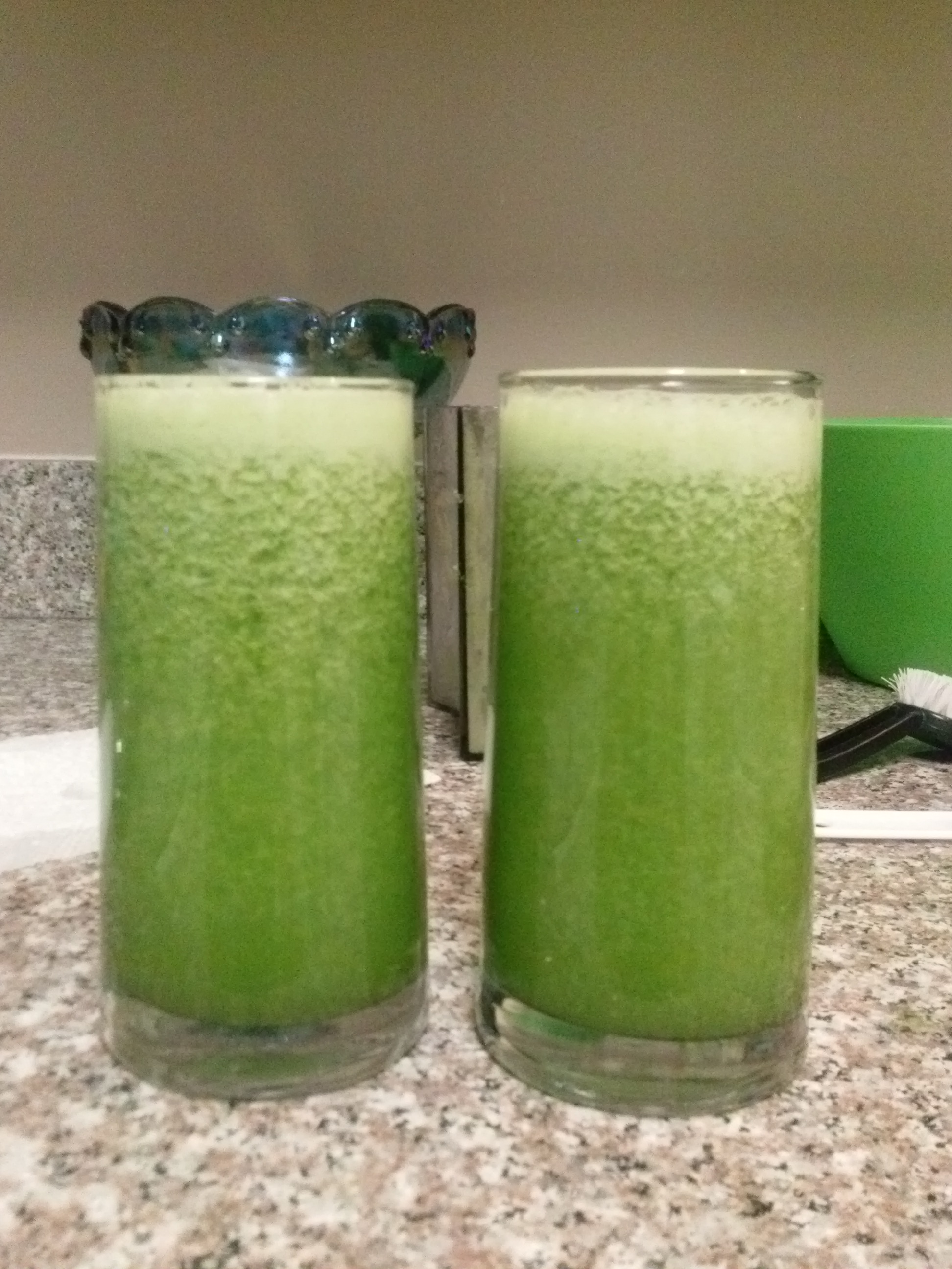 This is Sherri’s and my daily portion (the kids have the same contents just divided into 4 oz cups rather than 8 oz.) (2 Granny Smith apples, 1/2 lemon, 1 inch of ginger,1 cucumber, 5-8 stalks of celery, 1/2 head romaine lettuce)